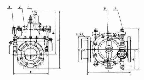 1、导阀2、主阀3、球阀4、压力表5、针表
